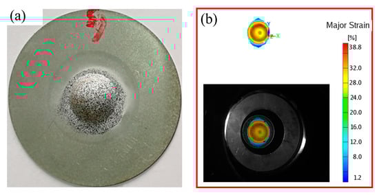 Strain measurement after white light scanning (blank holder force is 115 kN): (a) White light scanning sample, (b) Measurement results of major strain.