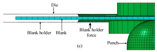 Equation (12) shows the constitutive equation for the finite analysis of the zinc coating, and it shows the interfacial binding parameters between the coating and the substrate in Table 3. Three kinds of finite element model are used to simulate the hemispherical part drawing process of nine groups of different blank holder force and drawing depth. The detailed setting parameters are shown in Table 4. Stroke in numerical simulation is controlled by punch stroke, that is, the drawing depth. The total number of numerical simulations for the hemispherical part drawing is 27 times.