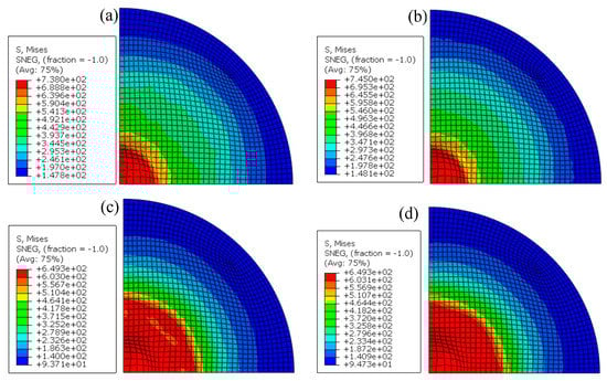 Numerical simulation results of the hemispherical part drawing under the blank holder force of 50 kN and the punch stroke of 9.76 mm: (a) Single-layer model, (b) Substrate of the three-layers model (Binding), (c) Upper coating layer (Contact with the die) of the three-layers model (Binding), (d) Lower coating layer (Contact with the blank holder and punch) of the three-layers model (Binding).