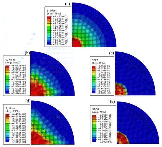 Numerical simulation results of the drawing of the five-layers model under blank holder force 50 kN and punch stroke 9.76 mm: (a) Substrate, (b) Upper coating layer (contact with the die), (c) Upper cohesive layer, (d) Lower coating layer (contact with the blank holder and punch), (e) Lower cohesive layer.