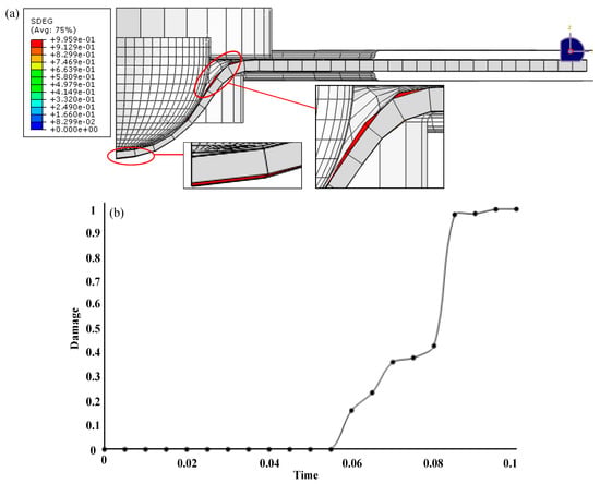 Figure 15 shows results from the numerical simulation of the five-layers model under blank holder force 50 kN and punch stroke 9.76 mm, which has two 0-thickness cohesive elements to describe the linkage between the coating and the substrate. Figure 15a is the stress distribution simulation result of substrate, which is similar to the simulation result of the three-layers model. Comparing Figure 14c and Figure 15b with Figure 14d and Figure 15d, it is shown that although the maximum stress of the coating layers on the upper and lower surfaces is the same as that of the three-layers model, the stress distribution is quite different. Figure 15c,e are the simulated results of the degradation of upper and lower 0-thickness cohesive layers. The damage coefficient scalar stiffness degradation (SDEG) in almost all deformation zones is 1.0, indicating that the cohesive element has completely degenerated under the action of biaxial tensile stress. It can be concluded that the galvanized coating layers and the substrate have been disconnected. Figure 16a shows the simulation effect of the separation of the zinc coating from the steel substrate. Under the action of tension, the interface cracks gradually, the damage coefficient “SDEG” is different, and interface cracks are different, especially galvanized layer cracks most seriously at the corner of the die and the top of the punch. As shown in Figure 16b, when the simulation time is between (0.05, 0.06), the cohesion element begins to damage, and gradually cracks with the increase of stress. When the simulation time is about 0.08, the cohesion element layer is almost completely damaged, and obvious cracking occurs between the zinc coating and the steel substrate. Therefore, the substrate and the coating layers are not completely binding in the drawing process. Once the galvanized layer is detached from the substrate, owing to its tiny thickness scale, it will be powdered under the dual action of friction and stress. The results of pulverization will further affect the formability and surface quality of sheet metal by friction. Therefore, the influence of the galvanizing layer on forming performance is a dynamic process. If it is necessary to simulate the formability more accurately, it is necessary to change the friction coefficient dynamically according to the degeneration of the cohesive element.