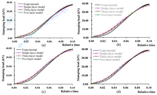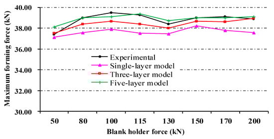 According to the above analysis results, the stress and strain between different models cannot be further compared because of different layers of the finite element models. Therefore, this paper focuses on comparing the accuracy of numerical simulation of different models by forming force. Figure 17 shows the comparison between the forming force of different numerical simulation models and experimental under four groups of different blank holder force and stroke. In the first half of the drawing, the numerical simulation results are larger than the experimental results, and the deviation is larger. However, with the drawing process of the latter half stroke, the numerical simulation value is smaller than that of experimental value, and the deviation between the two is decreasing. Moreover, 4 sets of results in Figure 16 show the same trend. However, on the whole, the deviation between the numerical simulation of a five-layer model and the experimental results is the smallest. Therefore, the results show that the forming force of the five-layer model is closer to the experimental results, and the numerical simulation accuracy is the highest. Comparatively, the accuracy of the single-layer model is the worst, while that of the three-layers model is in the middle.