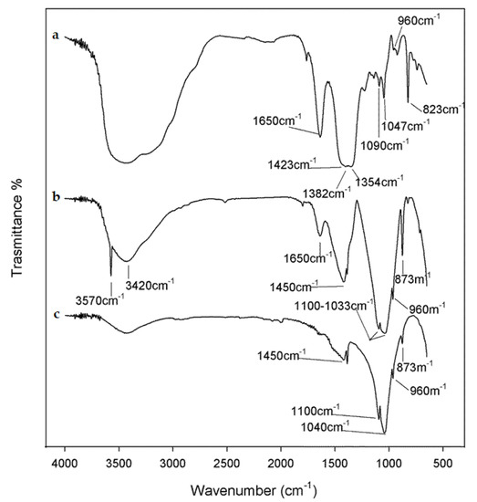 ATR-FTIR spectra of the hydroxyapatite coating untreated (a), treated at 600 °C (b), and treated at 1000 °C (c) are reported in Figure 3.