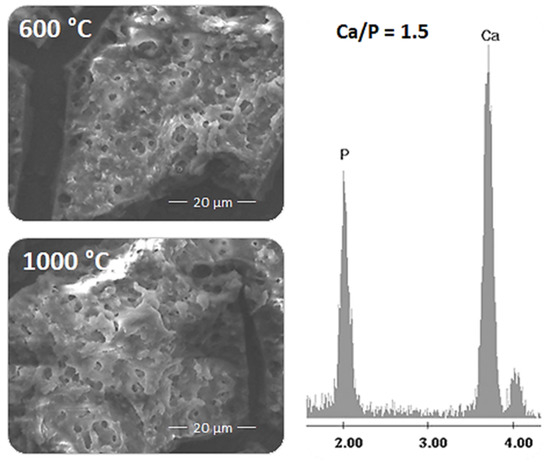 SEM images of HA coatings heat treated at 600 °C and 1000 °C are shown in Figure 4. Both samples appeared to have a porous structure with micropores of 3–4 µm in diameter on the surface. During sample calcination, a partial HA carbonation occurs due to atmospheric CO2 as a consequence of high calcium content in the prepared samples. This phenomenon is responsible for the Ca/P ratio of 1.50.