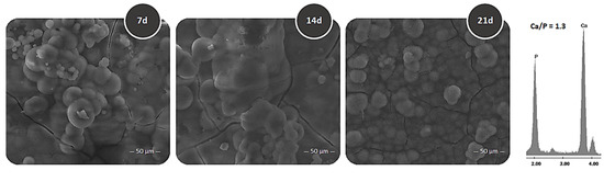 Sol–gel hydroxyapatite coating after soaking in SBF for 7, 14, and 21 days (Figure 5) showed the globular formations typical of physiological hydroxyapatite. Indeed, this was more evident at 21 days than at 7 and 14 days. The Ca/P ratio was 1.30 for the additional presence of carbonates in simulated body fluid solution.