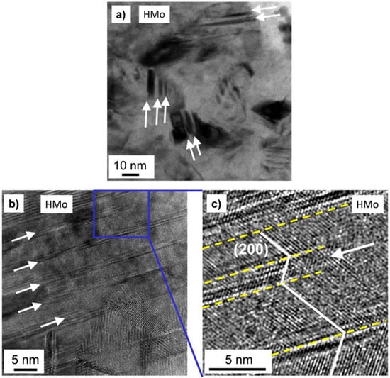 Bright-field TEM micrograph (a) and high-resolution TEM (HRTEM) image (b) taken on sample HMo. The white arrows indicate some twin faults. (c) shows a magnified and Fourier-filtered part of (b) (indicated by the blue frame). The dashed yellow lines mark twin faults. The white arrow in (c) indicates a twin lamella ending in the grain interior.