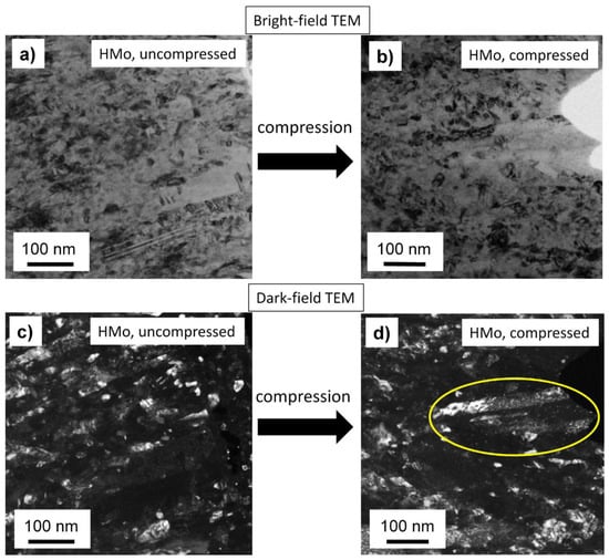 Bright-field (a,b) and the corresponding dark-field (c,d) TEM images taken on uncompressed (a,c) and compressed (b,d) micropillars for sample HMo.