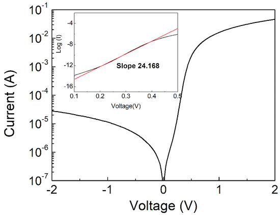 The ideality factor (n) is plotted by using the ln[I/(1−exp(−qV/kT))] versus voltage curve as shown in the inset of Figure 2, and n is extracted from the slope of this curve for the evaluation of the diode performance [25]. The current–voltage relationship for a Schottky diode can be expressed as I = Io[exp(qV/nkT)−1] ≈ Io *exp(qV/nkT), and gives ln(I) = ln(Io)+qV/nkT. Therefore, in this plot of ln(I) vs. V, the slope ( can be extracted, and the ideality factor is calculated using the below equation. Here, we extracted the value of 1.49 in the linear region. This could be attributed to the carrier recombination, tunneling, or the interfacial layer between the metal and the semiconductor [5,26].