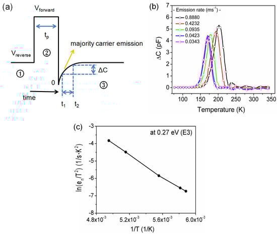 This transient capacitance behavior may have been caused by the positively charged defects through the thermal emission of carriers in the depletion region, and by decreased depletion width due to the increase in total charge density, as shown in Figure 5a–c. This is because the donor-type defect is positively ionized when it is unoccupied and neutral when it is filled with an electron [25]. In this manner, the signal gives out a different set of emission rates and temperatures. The trap emits carriers at this emission rate. As a result, transient capacitance was increased. This phenomenon is in agreement with those obtained from previous reports [27,31]. However, the origin of these defects is still unclear and complex. It requires further study to find the precise evidence of the defect formation.