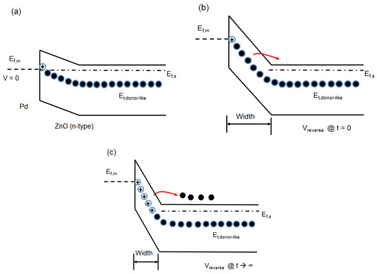 (Color online) A Schottky diode for majority carrier emission; (a) zero bias (forward bias), (b) reverse bias at t = 0, (c) reverse bias as t → ∞.