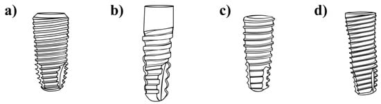 Schematic representation of the dental implants used in the study: (a) Sample 1, (b) Sample 2, (c) Sample 3, and (d) Sample 4.