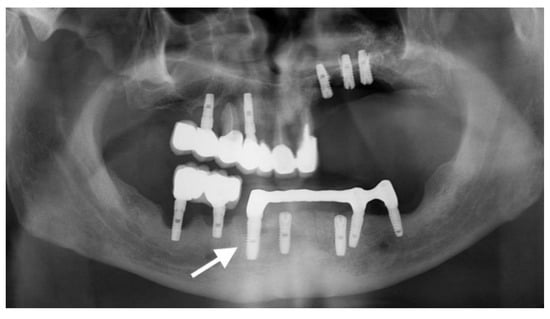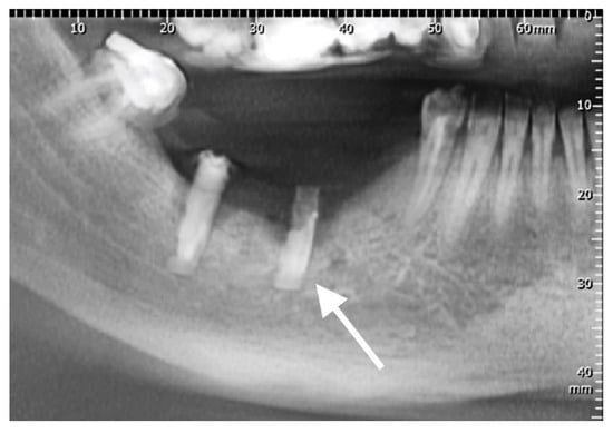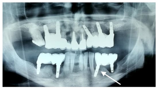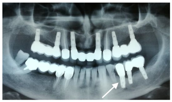 OPG radiography revealing peri-implantitis in quadrants 1, 2, and 3. The implants inserted in positions 1.2, 1.4, 1.6, 2.2, 2.4, 2.6, 3.5, 3.6, and 3.7 show generalized vertical and horizontal bone loss. The investigated implant is marked with an arrow.