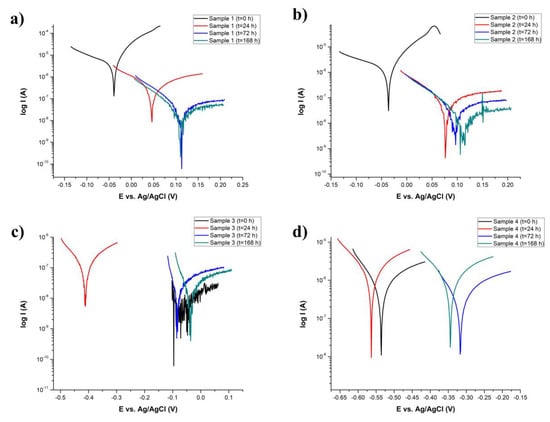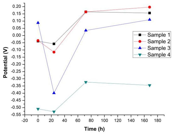 Voltammetry curves in Figure 7 showed a trend of increase of the electrochemical stability through electropositive shifts for the entire observed period for Samples 1 and 2 (Figure 7a,b, respectively). Similar findings were registered for Sample 3 (Figure 7c) with the exception of the initial measurement (t = 0 h), where the signal-to-noise ratio was very low. Sample 4 (Figure 7d) displayed similar characteristics of decreased stability with electronegative potentials in the first 24 h followed by increased stability with increasingly electropositive potentials.
