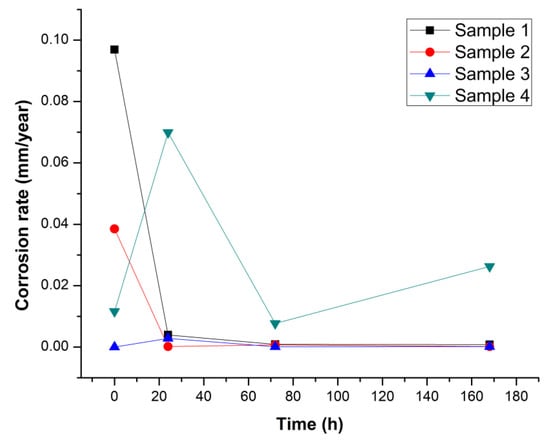 Corrosion rate variation is represented in Figure 8. The lowest value for Sample 4 (0.011 mm/year) and highest value for Sample 1 (0.096 mm/year) were recorded at t = 0 h. At 24 h the corrosion rate for Sample 1 decreased to 0.003 mm/year, resembling that of Sample 2 (0.00017 mm/year) and Sample 3 (0.002 mm/year). Sample 4′s corrosion rate varied the most, reaching 0.069 mm/year. After 72 h of immersion, the corrosion rate of Samples 1 through 3 showed a declining trend while Sample 4 registered a marked decrease, reaching 0.007 mm/year. At 168 h, Sample 4 recorded an increase in corrosion rate, reaching 0.026 mm/year, while Samples 1 through 3 registered a plateau, denoting a stability tendency.