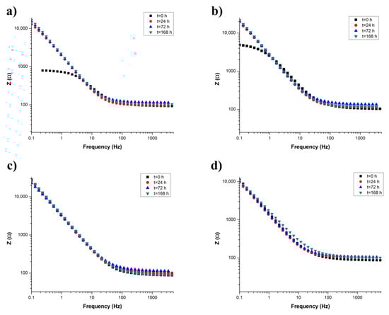 For all samples, the mid-frequency area was a transitional zone to a relatively constant region of impedance values recorded at high frequencies. At high frequencies, Sample 1 (Figure 9a) displayed a tendency towards stability. Sample 2 (Figure 9b) showed an increase in total impedance for the measurements at t = 72 h. Conversely, Sample 3 (Figure 9c) demonstrated an increase in total impedance at t = 72 h, followed by t = 24 h, t = 0 h, and t = 168 h. Sample 4 (Figure 9d) recorded minimal variation in impedances in all frequency domains (low, mid, and high).