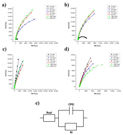 EIS measurements were performed for each sample over the 168 h of the experiment. Equivalent electric circuits for each sample were proposed and fitted at t = 0 h (at immersion), t = 24 h, t = 72 h, and t = 168 h (endpoint). Bode Modulus (impedance module vs. frequency) and Nyquist (imaginary vs. real impedance) diagrams were obtained and interpreted from the experimental and fitted data derived from the EIS measurements.