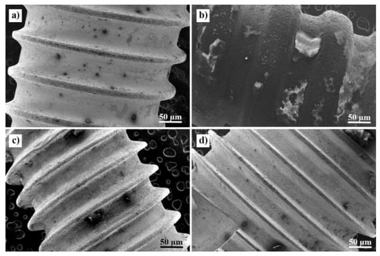 The SEM images were obtained prior to electrochemical measurements. Figure 11 shows the different types of implants, with their respective diameters and groove increments. The biggest diameter was recorded in Sample 2, while the smallest was in Sample 3. Sample 2 (Figure 11b) displayed bone tissue deposits that were subsequently mechanically removed with Teflon instruments and ethanol ultrasonic cleaning prior to the electrochemical determinations in order to prevent measurement bias by surface alterations. Samples 1, 3, and 4 displayed pitting corrosion areas on the surface, more prominent in Samples 3 and 4. Figure 12 shows the different roughness of the implants. Surface roughness in implant materials favors and stimulates osteoblast cells to osseointegrate the implant in the dental arch.