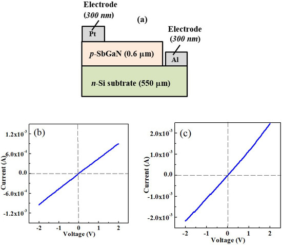 By employing RF reactive sputtering technology, the hetero-junction diodes have been also fabricated by depositing Sb-x-GaN thin films on n-Si (100) wafers. The diode structure was in the top-top electrode mode formed by sputtering the p-SbGaN film on n-Si substrate shown in Figure 1a. As known in the modeling of MOS, MS, homo or hetero junction diode, and metals with high work-function (Pt, Mo, Ni, …) were often used to make Schottky contact with n-type semiconductor and Ohmic contact with p-type semiconductor. On the other hand, metals with low work-function (Al, Ag, …) were often used to make ohmic contact with n-type semiconductor and Schottky contact with p-type semiconductor. Modeling of Pt/p-Sb-GaN/n-Si/Al in this work used Al to form ohmic contact with n-Si and Pt to form Ohmic contact with p-Sb-GaN. Figure 1b,c presented the I-V characteristics of Al/n-Si(100)/Al and Pt/p-SbGaN/Pt Ohmic contacts, respectively. The diodes with hetero-junction were fabricated by depositing the p-type Sb-0.07-GaN, Sb-0.14-GaN, and Sb-0.2-GaN films on n-Si substrates. The commercial Al and Pt targets (99.999%) were used to deposit the electrodes at 200 °C for 30 min on the top of film. The physical processes for fabricating the diodes with our deposited III-nitride thin films were detailed in our previous works [16,25,27,28,29].