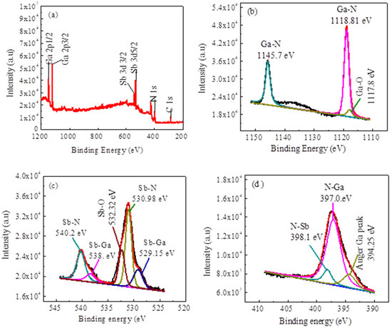 Figure 2 shows (a) XPS survey scan and high resolution, (b) Ga 2p, (c) Sb 3d, and (d) N 1s spectra of the Sb-0.14-GaN film. XPS was used to determine the chemical surface properties of the Sb-0.14-GaN film deposited on n-Si (100) wafer doped with phosphorus. The XPS survey data and the XPS peaks of Ga, Sb, and N elements shown in Figure 1 were investigated with the low intensity peak of C 1s at 284.6 eV in binding energy as a reference. Figure 2b shows the high resolution XPS spectrum with strong Ga 2p1/2 and Ga 2p3/2 peaks at 1145.7 eV and 1118.81 eV, respectively, for the confirmation of Ga-N bond in GaN [30]. The small peak at 1117.8 eV was contributed to the Ga-O bonding. Figure 2c shows the high resolution XPS peaks of Sb 3d3/2 and Sb 3d5/2 located at 540.2 eV and 530.98 eV, respectively, for Sb3+ in SbN bond [31], while peaks at 358.4 eV and 529.15 eV in binding energy were determined for Sb3− in GaSb bond [32,33].