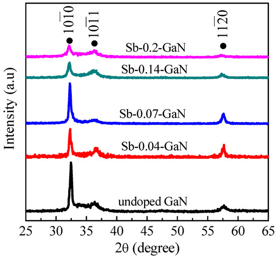 XRD patterns of Sb-x-GaN films sputtered at temperature of 300 °C and radio frequency (RF) sputtering power of 120 W in Ar/N2 atmosphere with different Sb contents (x = 0, 0.04. 0.07, 0.14, and 0.2) in single ceramic targets.