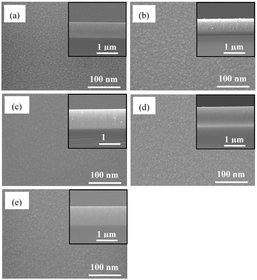 SEM surface morphologies of the deposited Sb-x-GaN thin films with x = (a) 0, (b) 0.04, (c) 0.07, (d) 0.14, and (e) 0.2. The insets are the individual cross–section images.