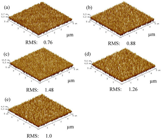 3D atomic force microscopy (AFM) morphological images of Sb-x-GaN thin films at x (a) = 0, (b) 0.04, (c) 0.07, (d) 0.14, and (e) 0.2.