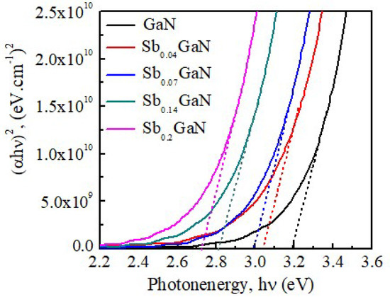 Plots of (αhν)2 versus photon energy (hν) for the optical bandgap denotation of the Sb-doped GaN films at different Sb dopants.