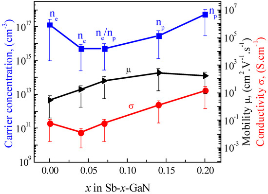 Electrical characteristics of carrier concentration (ne, np), mobility (µ), and conductivity (σ) (with the standard deviation at 5%) of Sb-x-GaN films grown at RF power of 120 W and heating temperature of 300 °C with different dopant Sb contents.
