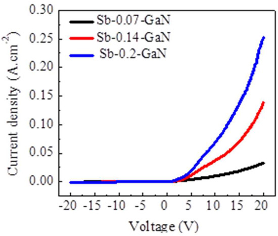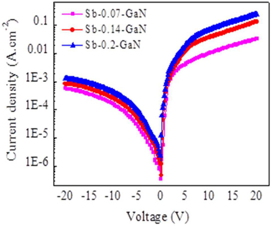 The reverse and forward current density-voltage log (J)-V plots of p-Sb-x-GaN/n-Si diodes (at x = 0.07, 0.14, and 0.2) tested at room temperature.