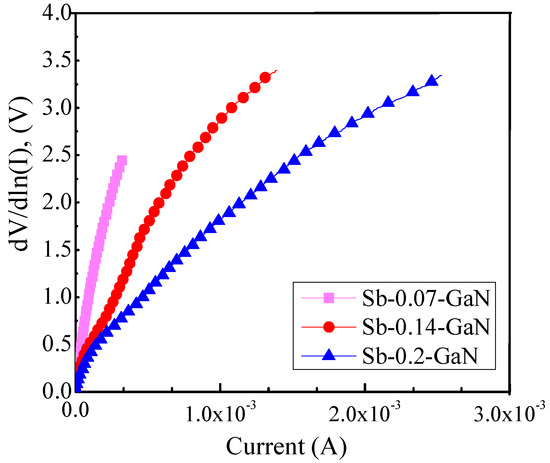 From Equation (4) and Figure 10 for the dV/d(lnI) versus current curves, the ideality factor n can be computed to be 5.95, 6.12, and 6.54, and the barrier height ϕB to be 0.49, 0.45, and 0.44 eV for Sb-x-GaN diodes at x = 0.07, 0.14, and 0.2, respectively. Table 4 displays the electrical characteristics of Sb-x-GaN diodes at x = 0.07, 0.14, and 0.2. It is shown that the decrease of turn-on voltage is corelated with the lower barrier height.