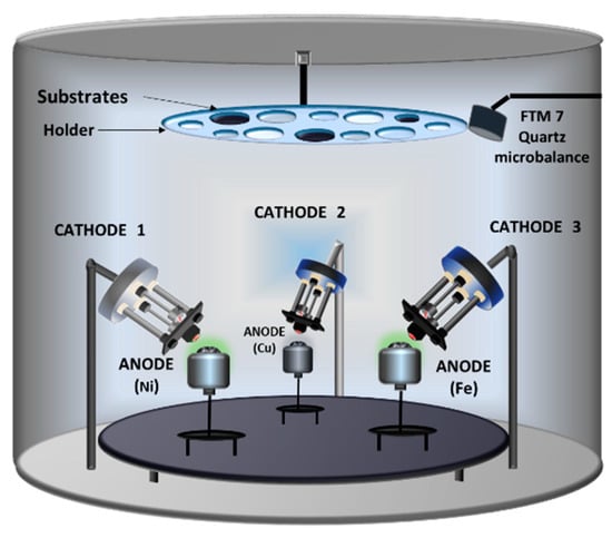 - Ilie, D.; Răsleanu, D.; Ionescu, V.; Mocanu, V.; Mureşan, M.G.; Oancea-Stănescu, I.M.; Ciupină, V.; Prodan, G.; Vasile, E.; Mustaţă, I.; et al. Preparation and characterization of Copper/Nikel nanostructurated multilayers using thermionic vacuum arc method. J. Optoelectron. Adv. Mater. 2010, 35, 839–843. [Google Scholar]