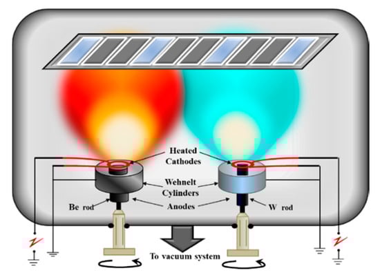 - Lungu, C.P.; Marcu, A.; Porosnicu, C.; Jepu, I.; Kovac, J.; Nemanic, V. Carbon–Tungsten Thin-Film Deposition by a Dual Thermionic Vacuum Arc. IEEE Trans. Plasma Sci. 2012, 40, 3546–3551. [Google Scholar] [CrossRef]