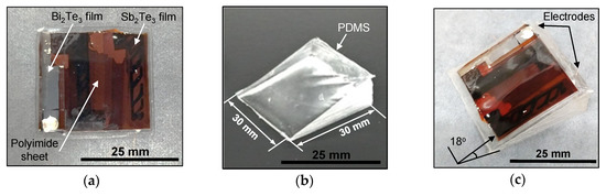 In this study, we used the STTEGs that were fabricated in our previous study [42]. In brief, n-type Bi2Te3 and p-type Sb2Te3 thin films were prepared on a stainless-steel substrate using potentiostatic electrodeposition and a standard three-electrode cell. Figure 1 shows the photographs of a typical STTEG with a slope angle of 18°. The STTEG mainly consists of two parts. In Figure 1a, the first part is a thin-film thermoelectric generator fabricated using electrodeposition and a transfer process [41]. The generator is composed of two pairs of n-type Bi2Te3 and p-type Sb2Te3 films with a length of 25 mm and a width of 6 mm, and these films are connected with silver pastes. The thickness of both types of the thin films is approximately 1 μm. The properties of the n- and p-type thin films and the STTEG are presented in Table 1 [42]. The second part is a slope block made of polydimethylsiloxane (PDMS) using a three-dimensional printer (Figure 1b). The PDMS was selected as the material for making the slope block because it possesses a relatively low thermal conductivity (0.18 W/(m⋅K)) and flexibility. Five types of slope blocks with rectangular-triangle shapes were prepared. The slope angle was varied from 8° to 28° by adjusting the height of the slope blocks while the depth and width of the slope blocks were fixed at 30 mm each. The thin-film thermoelectric generator was attached on the slope block using a heat conductive silicone grease and metal electrodes were connected to both the ends (Figure 1c). Note that the generator is detachable; the same generator can be assembled with five types of slope blocks at different slope angles.