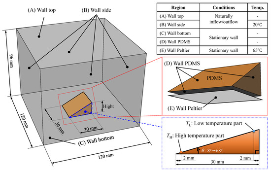 To compute the temperature distribution in the STTEG by putting it on a heat source, a steady three-dimensional model based on CFD was employed. Figure 2 shows the schematic diagram of a STTEG system used for the calculations. Ideally, the thin-film thermoelectric generator should be attached on a PDMS slope. However, to simplify the model, the temperature distribution of only the PDMS slope was estimated without the thin-film thermoelectric generator because the volume and heat capacity of the PDMS slope were significantly larger than those of the thin-film thermoelectric generator. The heat and mass transfer in the models of the PDMS slope and air atmosphere were governed in a three-dimensional model expressing the conservation of mass, momentum, and energy. A turbulence model was used as a standard k-ε model for compressible fluids. Region A (wall top) is the outlet of air. Region B (wall side) is the wall where air flows inwards and outwards. Region C (wall bottom) is the outlet of air. The temperature of the contact surface between Region D (wall PDMS) and Region E (wall Peltier) was constant at 65 °C, and the contact surface between PDMS and air was a stationary wall. The computations on the steady three-dimensional model with an unstructured grid were performed with a finite volume method using the commercial CFD-code SCRYU/Tetra V14. Table 2 presents the physical properties of the gas and material used in the calculations. The temperature distributions were calculated when the slope angle was varied from 8° to 68°.