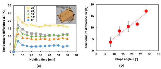 To estimate the temperature distribution of the STTEG, it was put on the Peltier module, and the surface temperature of the Peltier module was maintained at 65 °C. The temperatures of the STTEGs at hot and cold sides were measured using two K-type thermocouples. The measurement position on the hot side was 2 mm from the bottom center of the STTEG, and that on the cold side was 2 mm from the top center. Figure 3 shows the temperature differences between the hot and cold sides of the STTEGs at different slope angles. The time changes of temperature differences in the STTEGs are shown in Figure 3a. The STTEGs with all slope angles exhibited the largest temperature difference at 5 min because the heat flow did not sufficiently reach the cold side due to the low thermal conductivity of the PDMS. Thereafter, the temperature differences in the STTEGs with all slope angles decreased and saturated after 20 min. Thus, we demonstrated that stable temperature differences were achieved in the STTEG system with all of the slope angles in this study. In Figure 3b, the relationship between the temperature difference and slope angle is presented. The temperature difference is the averaged value in the stable region from 20 to 60 min. The temperature difference linearly increased with the slope angle. The deviation between the experimental results and linear fitting was approximately ±6%. The maximum temperature difference was 17 K at a slope angle of 28°.