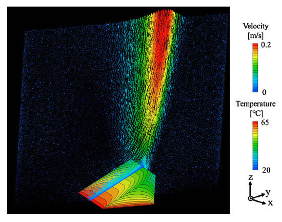 Temperature distribution of PDMS and the air velocity vector at a slope angle of 28°. The velocity vector and temperature of each color bar range from 0.0 to 0.2 m/s and from 20 to 65 °C, respectively.