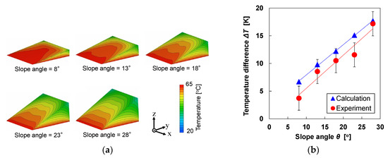 A typical result of a numerical analysis presenting the temperature distribution of the PDMS slope and the air velocity vector at a slope angle of 28° is shown in Figure 4. The surface color of the PDMS slope and arrow represents the temperature distribution and vector of flow velocity in the x-axis section, respectively. The flow velocity tended to be faster above the top of the PDMS slope, indicating that heat dissipation occurred near the top of the slope. The surface temperature of the PDMS slope tended to decrease on increasing the distance from the heat source part (Region E in Figure 3). The temperature distributions on the surface of the PDMS slopes at different slope angles are shown in Figure 5a. At a slope angle of 8°, the area with the temperature over 60 °C occupied the maximum slope surface. When the slope angle increased, an area with a lower temperature was seen near the top of the slope. No irregular temperature unevenness was observed for all of the slopes. In Figure 5b, the temperature differences observed in the computational analyses and the experimental measurements are compared with those in Figure 3b, where the temperature measurement positions were the same in both cases. The calculated temperature difference was approximately 16% higher than that obtained in the experimental measurements. This is possibly because the numerical analysis was performed under ideal conditions where air at a constant temperature was supplied into the analysis area. As a result, the cooling effect of the low-temperature part of PDMS was promoted by its steady natural convection, which was apparent in the model of the lower slope angle. The trends between the slope angle and the temperature difference were similar in both cases. Therefore, we concluded that a computational model that reproduced the experimental results was created.