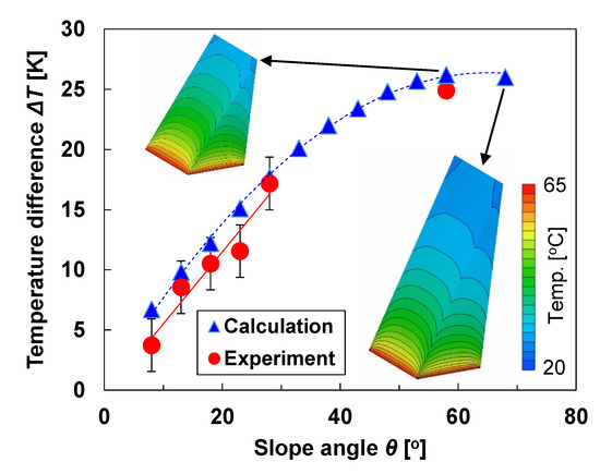Figure 6 shows the temperature differences in the PDMS slopes that were calculated at slope angles higher than 28° using the created calculation model. According to the calculation results, the temperature difference (ΔT) increased linearly up to the slope angle of 40° on increasing the slope angle, and then saturated at the slope angle of 58°. The appearance of this saturation can be explained as follows: when the thermal resistance increased on increasing the distance from the heat source to the cold side, the temperature of the cold side reached 20 °C (ambient temperature) at a slope angle of 58°, as described in the inset of Figure 6. In order to evaluate the validity of the calculation results, a PDMS slope block with an angle of 58° was fabricated, and then we measured the temperature difference. As a result, the experimentally measured temperature difference was 24 K, which was only 8% lower than the calculated value at the corresponding angle. Therefore, we may conclude that the calculation model in this study obtained sufficient accuracy even though the slope angle was higher than 28°.