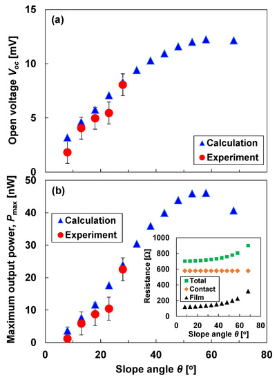 Figure 7 shows the thermoelectric performance of STTEGs as a function of slope angle. In this study, we assumed that the length of the STTEGs increased as the slope angle was increased. This is because the length of the slope increased as the slope angle increased, as described in the inset of Figure 6. The relationship between the open circuit voltage (Voc) and the slope angle is shown in Figure 7a. The Voc is independent of the length of the STTEGs. The experimentally measured Voc is presented from 8° to 28°. In this range of angles, the measured Voc linearly increased as the slope angle increased. The maximum measured Voc was 8.1 mV at the slope angle of 28°. Based on the measured values, the Voc was calculated at the angles from 8° to 68°. For higher slope angles, we did not calculate Voc because the temperature difference became saturated, as shown in Figure 6. The values of Voc/ΔT using the experimentally measured Voc and ΔT were estimated at five angles from 8° to 28°. The five values of Voc/ΔT were then averaged, and the Voc that was estimated based on the averaged Voc/ΔT and the calculated ΔT is shown in Figure 6. We assumed that the thermoelectric properties of p- and n-type thin films were not changed in the entire region during this study. The average error between the experimental and theoretical values at the slope angles from 8° to 28° was approximately 20%. When the slope angle was increased up to 28°, the Voc increased and then became saturated at slope angles higher than 58°. The calculated maximum Voc was 12.2 mV at the angle of 58°. Therefore, when the heat source temperature was set at 65 °C, STTEGs can produce the Voc of 12.2 mV by optimizing the slope angle. To further increase the Voc, it is necessary to increase the number of p–n pairs of thin films.