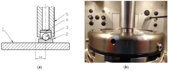 Scheme of counter-sample mounting; 1—sample (rotating disc), 2—self-aligning counter-sample, 3—ball bearing, 4—ball bearing holder, 5—load transmitting rod, FR—friction radius (a); view of test chamber (b).