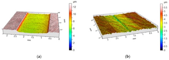 Various fabrication techniques were used for surface texturing []. Laser texturing is the most widely used, because this method seems to be the most flexible and efficient [,,,,,,,]. Abrasive jet machining can be an alternative to laser texturing [,,,]. The other methods include electrochemical etching, lithography [], photochemical texturing, burnishing (embossing) [,] and some kinds of machining (honing [,,] or grinding). A sharp tip can be also used for creating grooves []. This process can be facilitated using machines equipped with CNC.