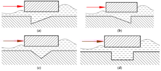 Schemes of bottom profiles of grooves with marked sliding direction of the counter-sample. (a) Convergent; (b) Dam; (c) Both side convergent; (d) Both side dam.