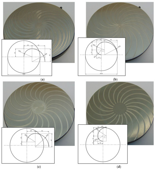 Figure 5 shows photos of discs with spiral patterns of grooves and dimensions of guiding lines of these grooves from the discs of types 2–4. There were 20 grooves on each disc. The number of test repetitions was at least 3.