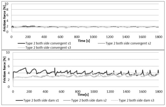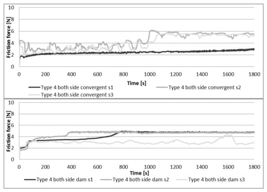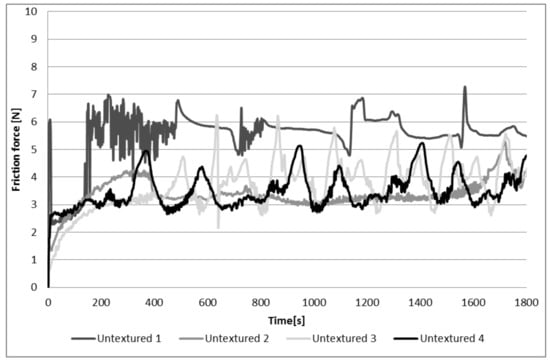 Figure 11 shows graphs presenting the friction force versus time for assemblies with textured discs of types 4 and 5.