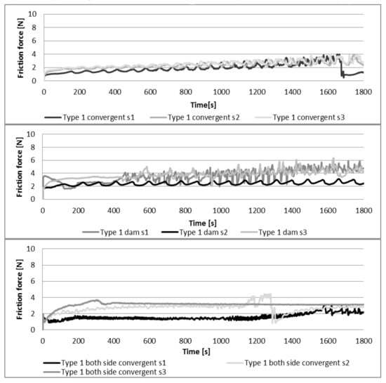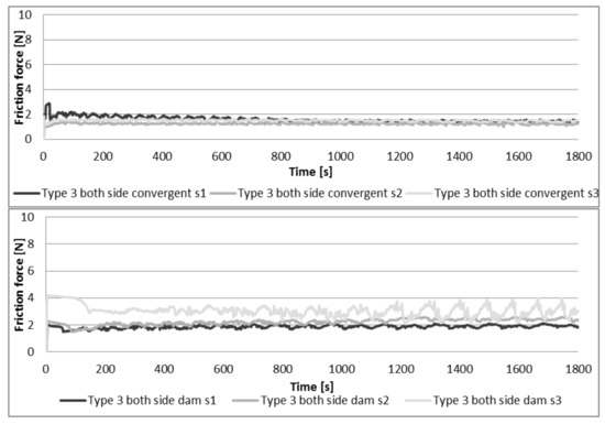 Changing the bottom profile from convergent to dam for the disc of type 2 caused an increase in the friction force, its variation also increased between and within test runs. After a few seconds the friction force obtained values of 3–4 N and then in two runs the friction force marginally increased, while in the third case – decreased. The final value of the friction force was between 3 and 5 N.