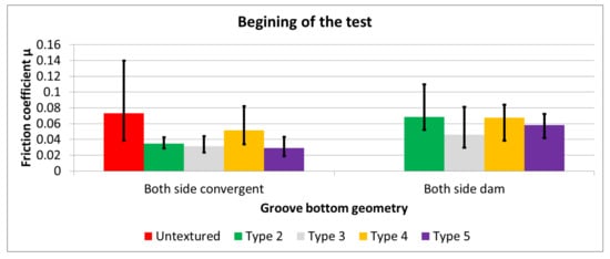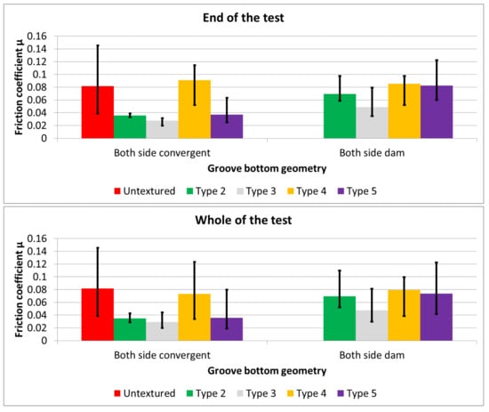 Figure 12 shows average friction coefficients with scatters for textured discs with spiral grooves of types 2, 3, 4, and 5 during the whole test as well as at the beginning and at the end of tests. Since, in most cases, the friction force was nearly constant during the test, three graphs were similar. The smaller scatter of the friction force was obtained in the final parts of tests. The best results (the smallest friction forces values and scatters) were achieved for the discs of type 2 and 3 with convergent groove profile bottoms. For the disc of type 5 the convergent profile bottom of the groove led to better results, however, the scatter of the friction force was comparatively high. The worst results (high friction forces values and scatters) were obtained for the disc of type 4 independently of its groove bottom profile.