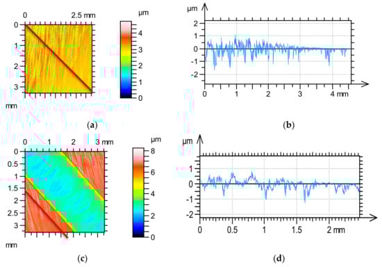 Contour plots (a,c) and extracted profiles (b,d) of worn untextured disc surface (a,b) and surface of type 1 with both side dam bottom shape of the groove (c,d).