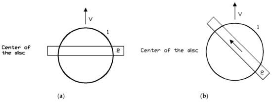 In the beginning of each test a volume of 5 mL of semisynthetic motorcycle oil 10W40 T4 was supplied to the test zone. There are the following parameters of a lubricant: kinematic viscosity 66 mm2/s (66 cSt) at 40 °C, and 13.5 mm2/s (13.5 cSt) at 100 °C, ignition temperature 180 °C, and a freezing point of −18 °C. This specific oil was selected due to its designation to high-performance motorcycle engines. Base surfaces of samples were ground and some of them were tested without texturing as reference samples, their roughness parameter Ra was 0.25 ± 0.01 µm. Surface texturing was made by precise milling. The milling process was chosen due to the great accessibility of CNC mills. We tried to present the possibilities of using standard CNC machines in surface texturing instead of using other techniques, like laser surface texturing, electrical discharge machining or etching, in which additional devices are required. Moreover, thanks to careful production process planning it is possible to create grooves by adding only one additional operation to CNC machine. That approach does not lead to a high increase in the production cost. Three types of the milling process was used. The first one required 5 axis CNC milling machine, where mounted disc was tilted by 0.5° from the horizontal direction. This approach helped to form a groove of with a sharp edge on one side and a convergent bottom on the other side (Figure 2).