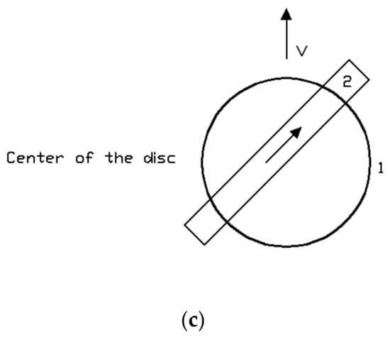 Scheme of oil flow inside the groove depending on the contact between the spiral fragment and the counter-sample; V- linear speed, 1–the contact area with the counter-sample, 2–the position of the spiral groove; (a) equal flows of the lubricant, (b) the flow directed to the center of the disc, and (c) flow outside the disc.