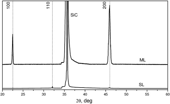 Figure 1 shows comparative XRD patterns of the 300 nm BST films deposited on SiC substrates. The multi-layer BST thin film prepared by using the intermediate annealing (C, C, indicated in Figure 1 as “ML”) and the single-layer BST thin film (C, indicated as “SL”) show different growth behaviors. A scan indicates that multi-layer film shows highly (h00) oriented perovskite structure while the single-layer film is polycrystalline. The value of the calculated cubic lattice parameter of both grown films is 0.3947 nm, giving the composition BaSrTiO, which corresponds to the BST target stoichiometry. This fact is confirmed by the dielectric permittivity behavior vs. temperature with maximum at 200 K (not presented here), which is equal to the phase transition temperature of bulk ceramic.